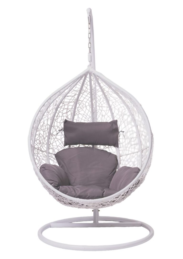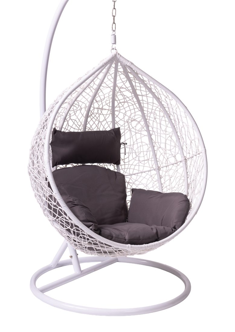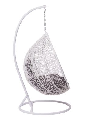 Valkoinen riipputuoli tummanharmailla pehmusteilla on rento istuin, joka luo kesäfiilistä tapahtumakalustukseen. Polyrottinkinen, pallon muotoinen istuinosa tarjoaa rauhallisen lepohetken. Tuote sopii myös ulkokäyttöön. Maksimikuorma 120 kg.